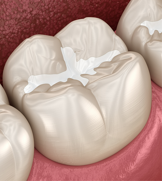 You can think of dental sealants as non-invasive, invisible layers of protection that we put over the biting surface of your molars. We simply brush liquid over the fissures of the teeth and cure it to form a smooth layer of protection. This prevents food debris from accumulating in the pits and grooves and leading to cavity formation.