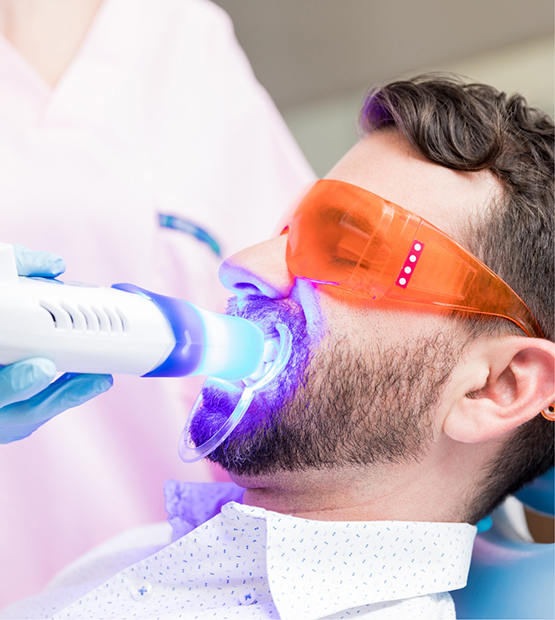 We place a protective barrier on your gums to prevent irritation, then apply the whitening gel to tooth surfaces. You’ll sit for about 15 minutes with an LED light directed at your teeth, which activates the whitening agents. Then, we remove the gel, check the progress, and repeat as many as four times until we achieve the desired results. The entire process takes about an hour.